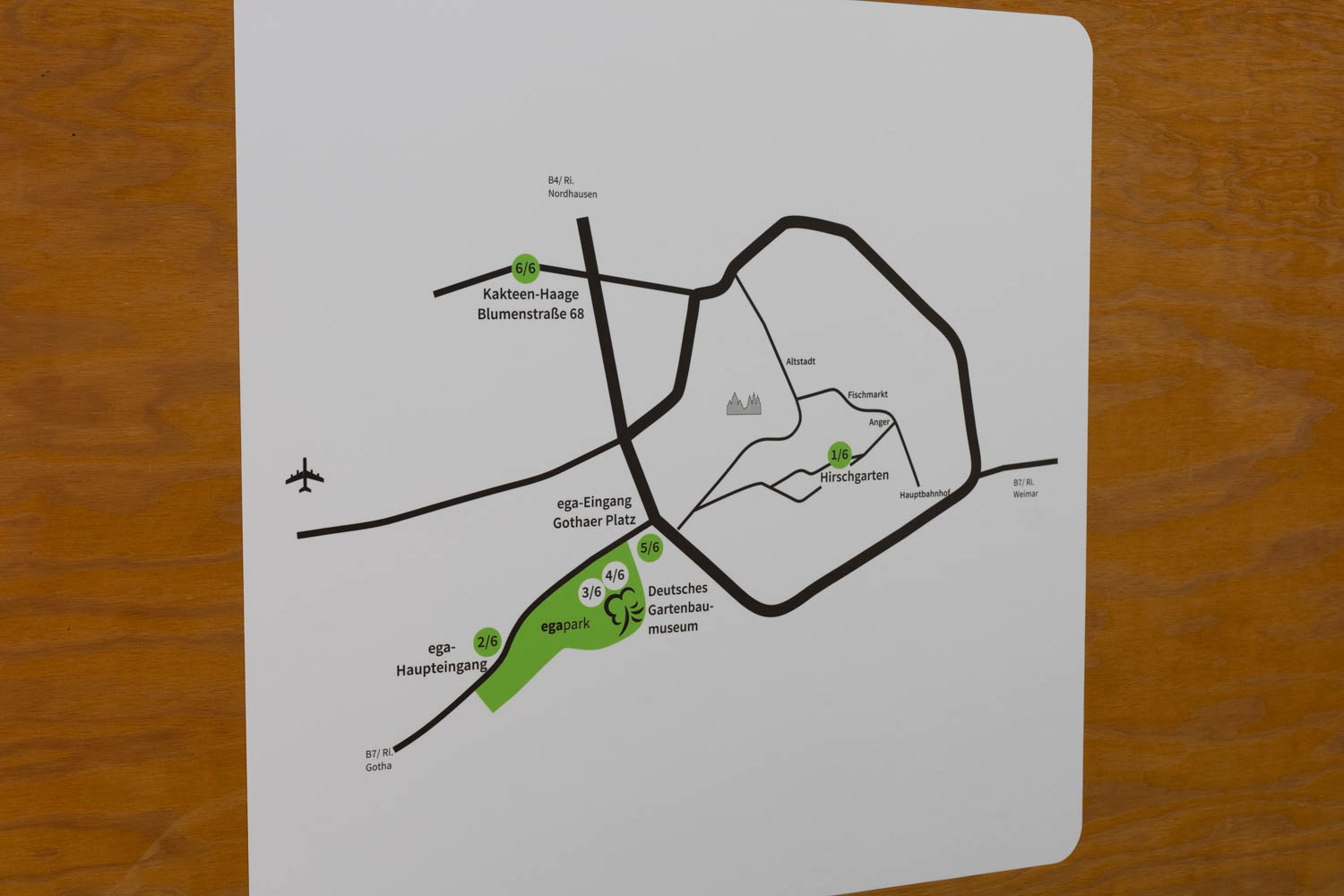 Weitere Stationen: Vorplatz egapark Haupteingang, Vorplatz und Innenhof Deutsches Gartenbaumuseum im egapark, Gothaer Platz, Vorplatz Kakteenzucht Haage (Blumenstraße 68)