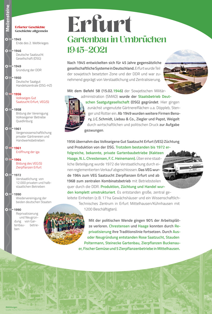 1956 übernahm das Volkseigene Gut Saatzucht Erfurt (VEG) Züchtung und Produktion von der DSG. Trotzdem bestanden bis 1972 erfolgreiche, bekannte, private Gartenbaubetriebe (Kakteen Haage, N.L. Chrestensen, F.C. Heinemann).