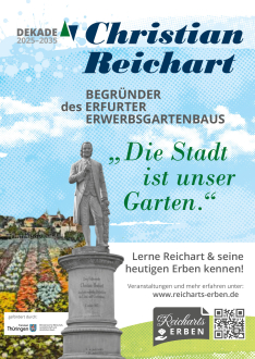 Christian Reichart, einer der bedeutendsten Persönlichkeiten der Erfurter Stadtgeschichte, gilt als Begründer des modernen Erwerbsgartenbaus in Deutschland. Mit seinen Innovationen prägte er Gartenbau und Landwirtschaft, Handel, Stadtentwicklung und Kultur und legte damit das Fundament für den Ruf Erfurts als Blumenstadt. In seinem Jubiläumsjahr ist es an der Zeit, dem großen Visionär „Danke“ zu sagen, dessen Impulse bis heute nachwirken. Das Dankeschön wird zu einer offenen Einladung, innezuhalten, zu reflektieren und mit Anregungen das Deutsche Gartenbaumuseum für weitere Entdeckungen zu besuchen.